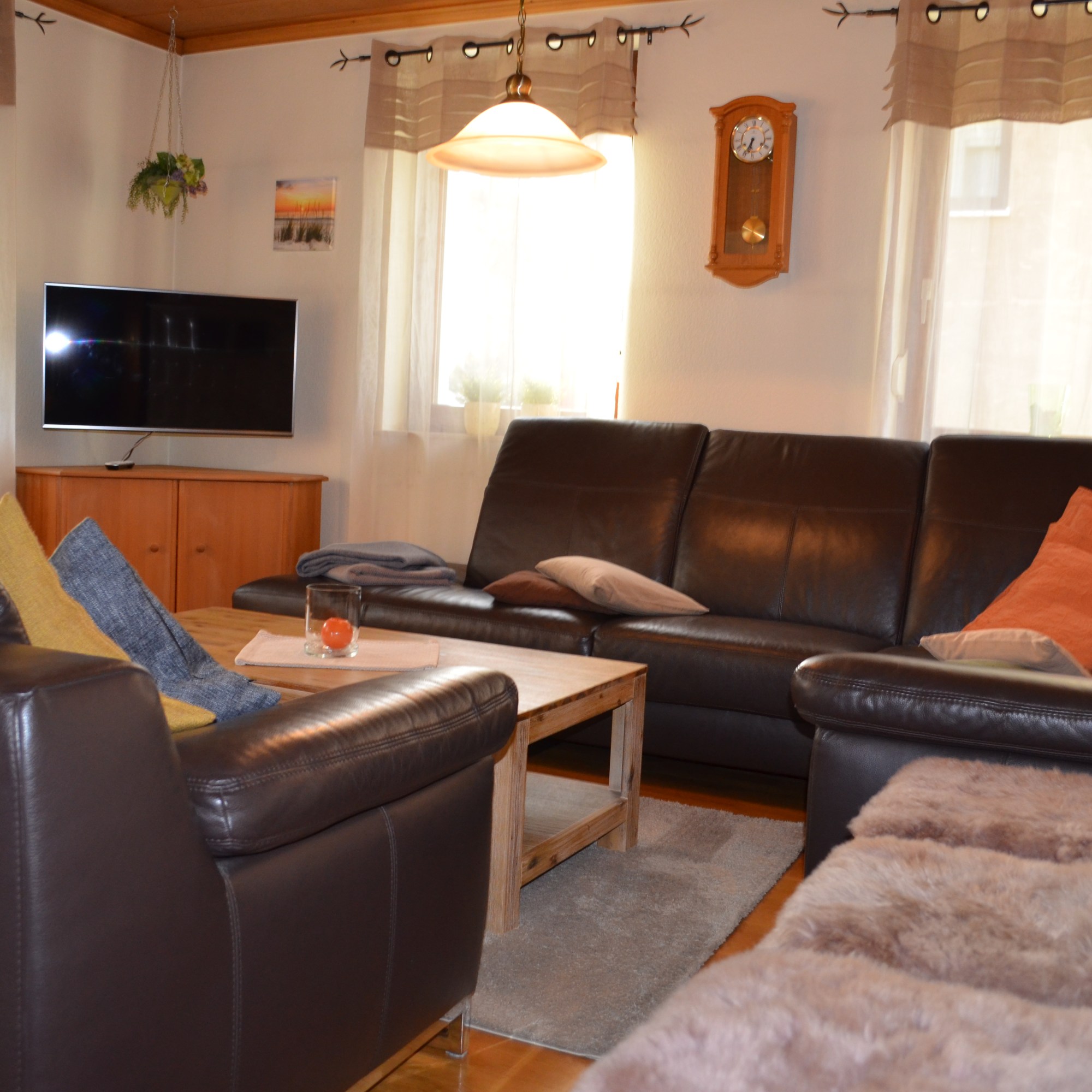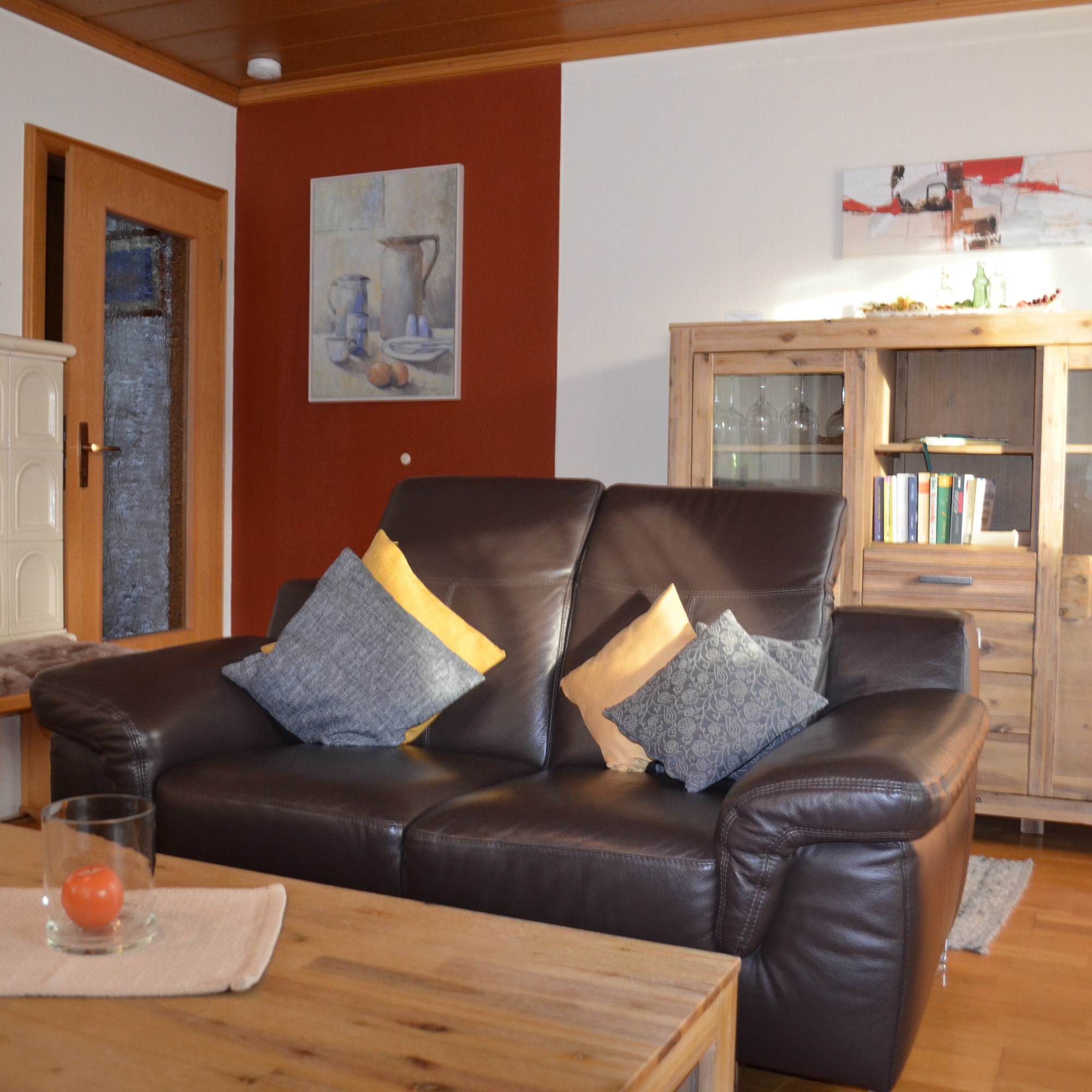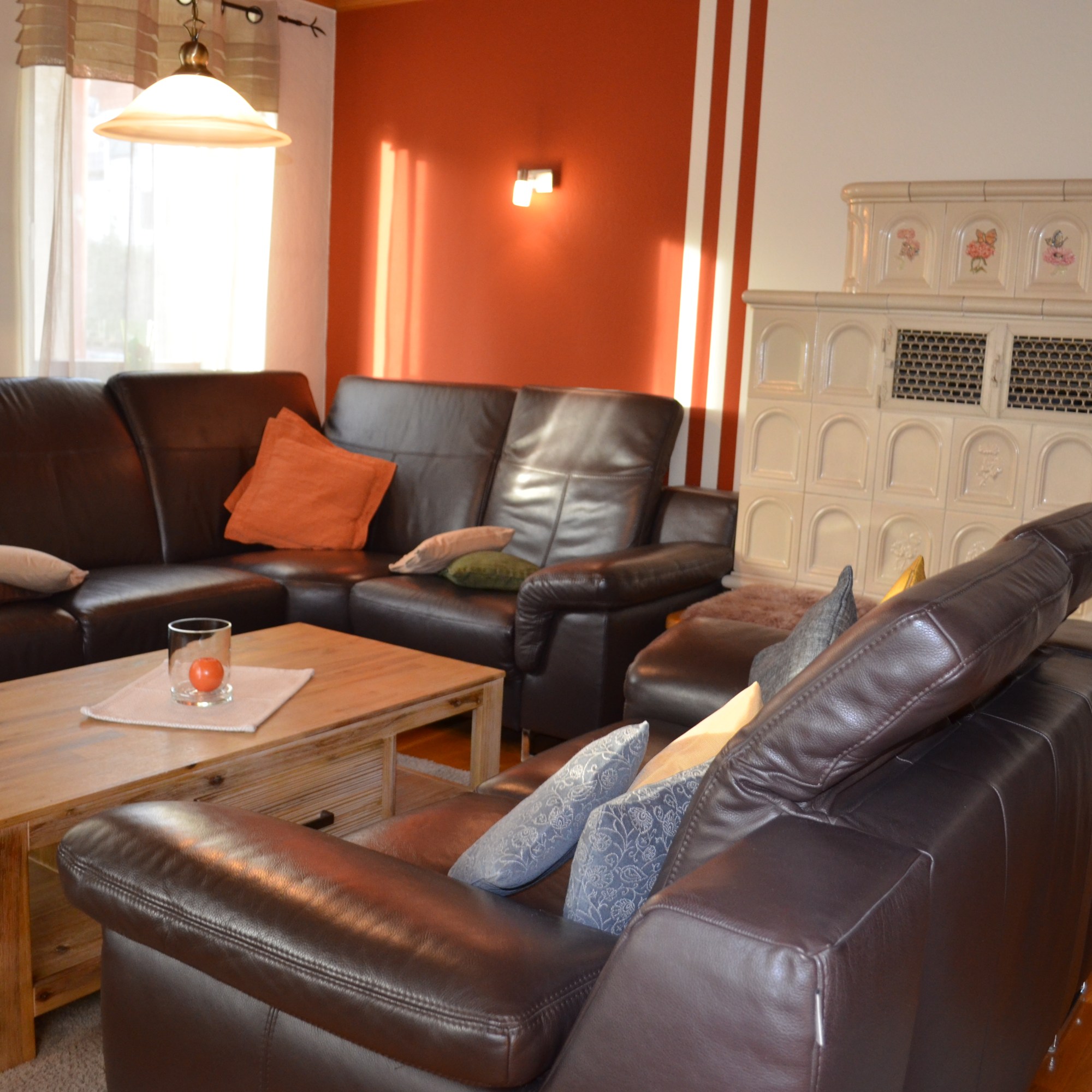 - Wohnzimmer mit beheizbarem Kachelofen (Wintersaison), Ledercouch, Flachbildschirm/Smart-TV