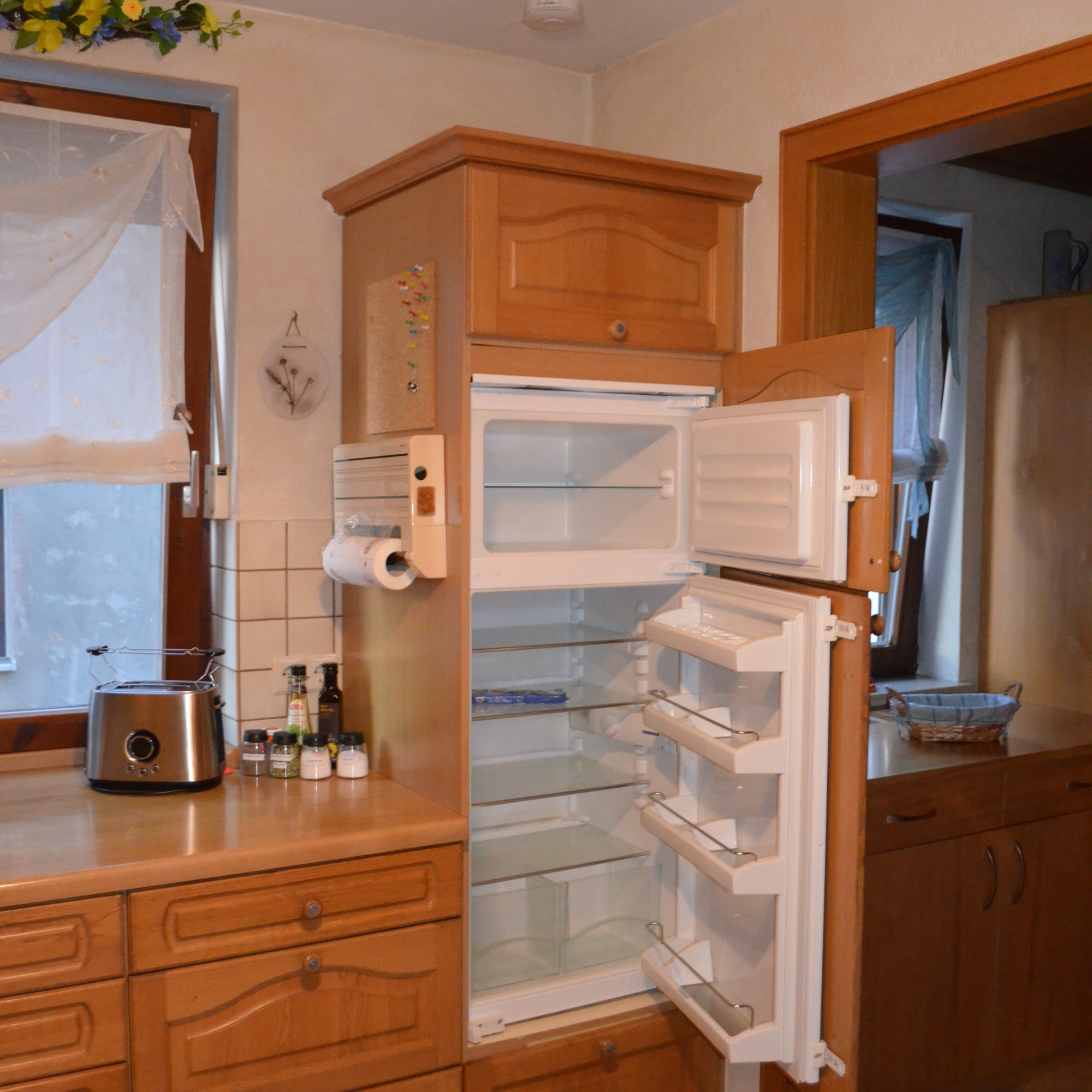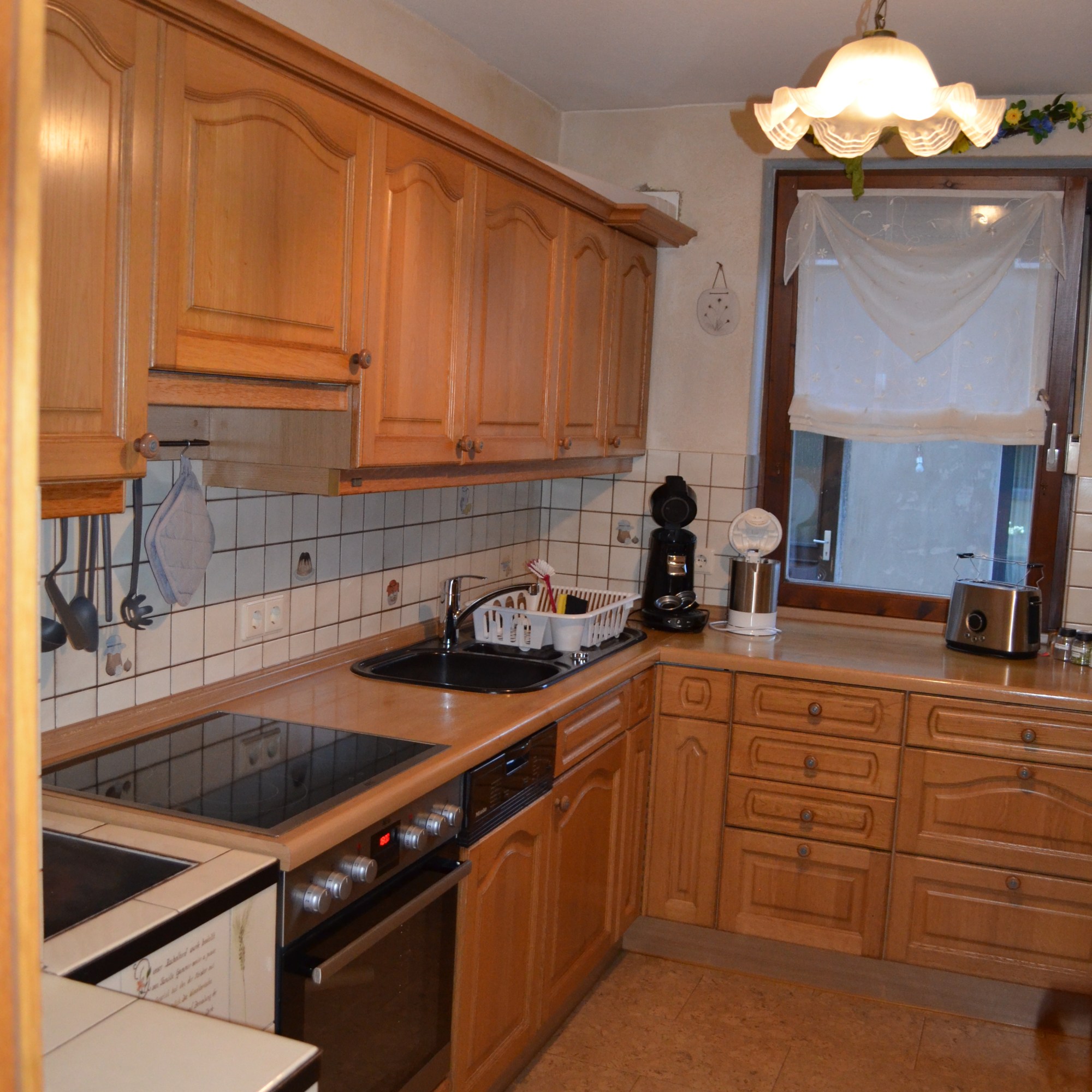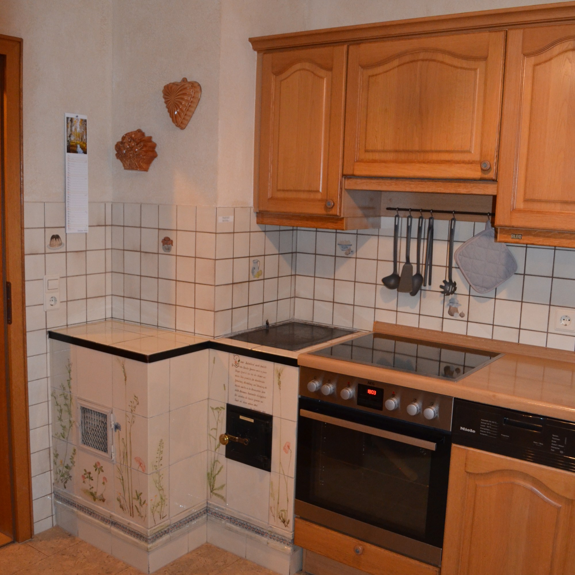 - Komplett eingerichtete Küche mit E-Herd, Mikrowelle auf Wunsch und Anfrage, Kachelherd (in der Wintersaison beheizt), Geschirrspüler, Kühlschrank, Küchenwäsche ausreichend vorhanden